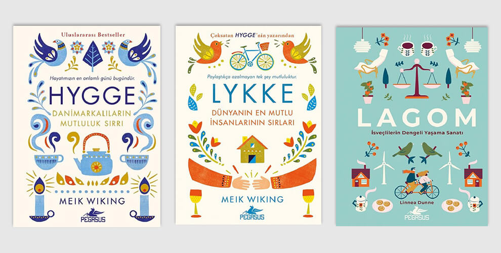 Hygge, Lykke ve Lagom; bize Danimarkalıların ve İsveçlilerin mutlu ve dengeli yaşama sırlarını anlatıyor. Koltukta kıvrılıp dinlenmenin huzurunu, dostlarınızla güzel bir yemek yemenin keyfini, güneşli bir günde pencereden süzülen ışığın yaydığı neşeyi, Danimarkalılar Hygge ile tarif ediyorlar. Lykke ise Danca’da mutluluk demek. Danimarkalılar’ın neden dünyadaki en mutlu insanlar olduğunu çeşitli örneklerle ve hikayelerle anlatan Mutluluk Araştırmaları Enstitüsü başkanı Meik Wiking, tüm bu tanımların ötesine geçip hayatınızda lykke ve hygge anlar yaratabilmeniz için bu kitaplarda size rehberlik ediyor. Lagom, İsveçlilerin ‘ne çok ne az, tam kararında’ anlamına gelen yaşam felsefesi. Bu kitap hem lagom anlayışının iş-hayat dengesi, yeme-içme, bilinçli tüketim ve tasarım açısından anlamını açıklığa kavuşturuyor hem de sürdürülebilir mutluluğu kendi içimizde bulmamıza yardım ediyor.