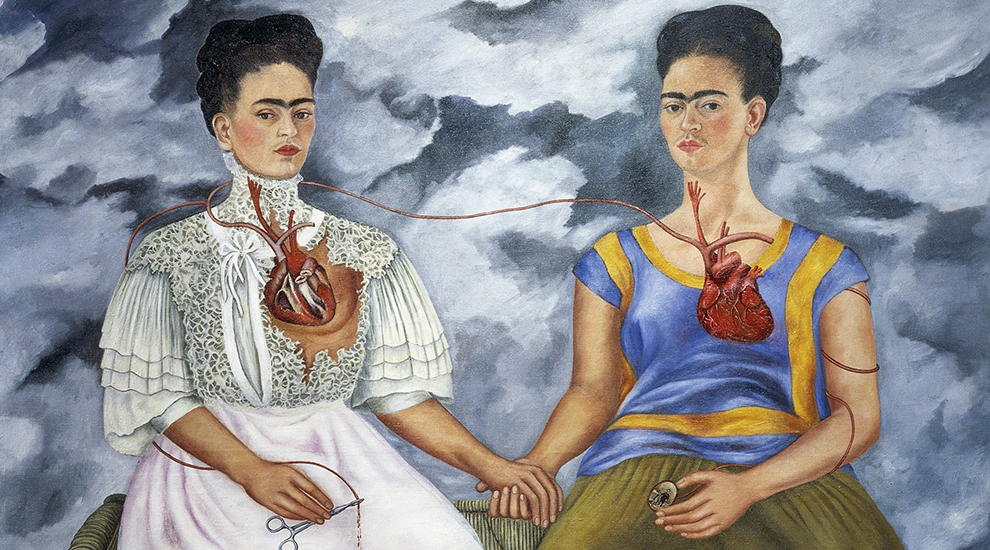 Bu zorlu yaşamını ve tüm zorluklara rağmen hiç bitmeyen tutkularını tablolarına yansıtan Frida’nın en önemli eserlerinden biri ‘İki Frida’dır. Tabloda hem fiziksel yaralarını hem de psikolojik yaralarını tasvir eden iki farklı Frida görüyoruz. Yan yana oturan ve el ele tutuşan Frida’lar birbirinden çok farklı bir görüntü çiziyor. Frida’lardan birinin üzerinde beyaz bir Victoria dönemi elbisesi görüyoruz, diğerinde ise geleneksel bir Meksika elbisesi var. İlginç detaylardan bir diğeri ise, iki Frida’nın da ellerinde tuttuğu objeler. Meksikalı Frida’nın elinde kocası Diego Rivera’nın küçük bir portresini, diğer Frida’da ise bir makas görüyoruz. Diego’nun resminden başlayan damar beyaz elbiseli Frida tarafından kesiliyor. Bu elbisenin üzerine damlayan kanlar ise Frida’nın geçirdiği ameliyatları, düşürdüğü çocuklarını ve Diego ile ayrılığını temsil ediyor.